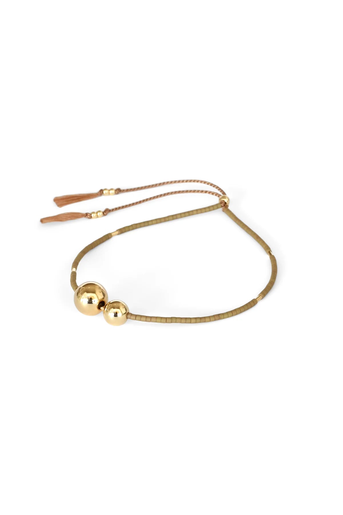 Hati is an adjustable bracelet. Matte glass beads are unexpectedly accented with gold details and adorned with two, free-moving, dissimilarly-sized gold spheres.