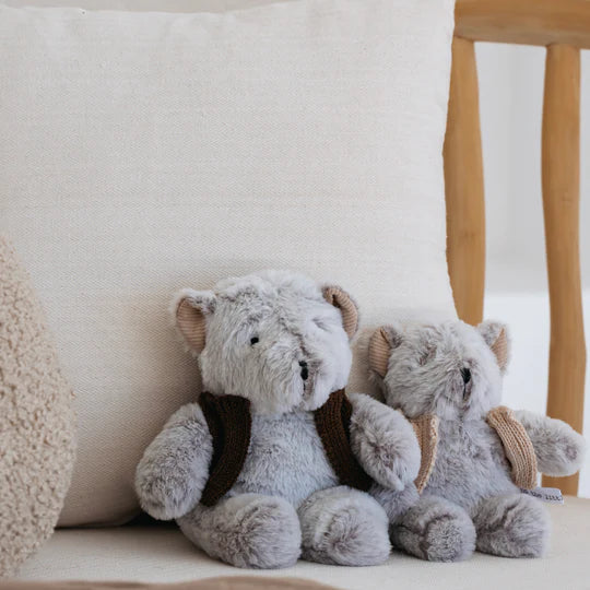 Our adorable, soft and very cuddly Alfred bear is the perfect companion. He loves collecting shells, rainbows and taking a bubble bath at night. He doesn't like scratchy jumpers. He has corduroy ears and loves to keep warm in his knitted Australian merino wool jumper.