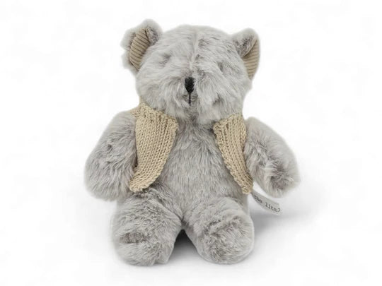 Alfred bear is perfect for little fingers. Measuring 20cm, he loves collecting shells, rainbows and taking a bubble bath at night. He doesn't like scratchy jumpers. He has corduroy ears and loves to keep warm in his knitted Australian merino wool jumper.