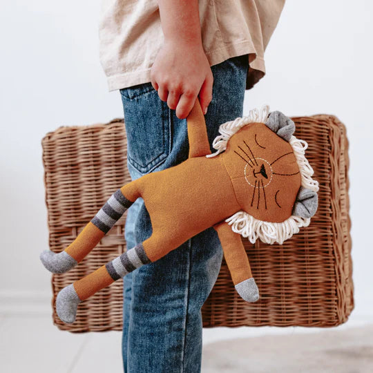 Archie the lion, made from super soft pure cotton in a delightful mustard color, he is perfect for snuggling.