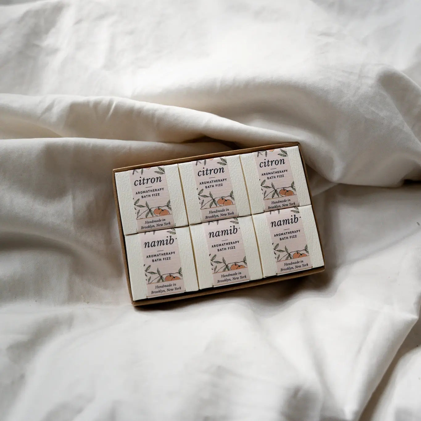 In this box is a set of six handcrafted clay bath fizzies/shower steamers, infused with our signature citrus blends of 100% pure essential oils to provide you with a refreshing, aromatherapeutic experience.