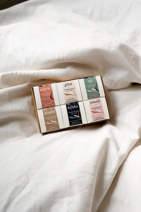 Each cube feels cool and weighty in your hand, like a small piece of sculpted marble softened by water.There’s calm in its simplicity — a pause between breath and motion, a reminder that beauty can steady you before the day begins. Each soap cube is hand-poured, cured for weeks, and made with kaolin clay, activated charcoal, and nourishing plant oils to cleanse without stripping the skin. The blends shift from citrus to wood to mint — scents that move with you through the day.