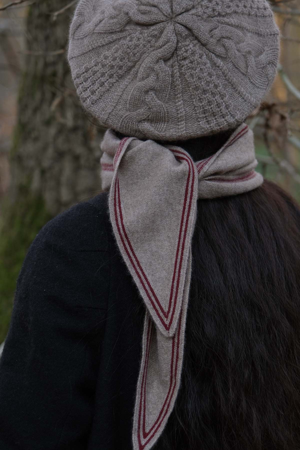 Elevate your winter wardrobe with the soft allure of this warm brown scarf, beautifully accented with a rich wine trim. The subtle contrast between the two tones enhances the natural elegance of the cashmere, making it an ideal accessory to complement both casual and formal outfits. Whether worn casually or styled for an evening out, this timeless piece adds a sophisticated touch to your ensemble. Enjoy the plush comfort of premium cashmere while embracing a pop of color that’s perfect for colder months.