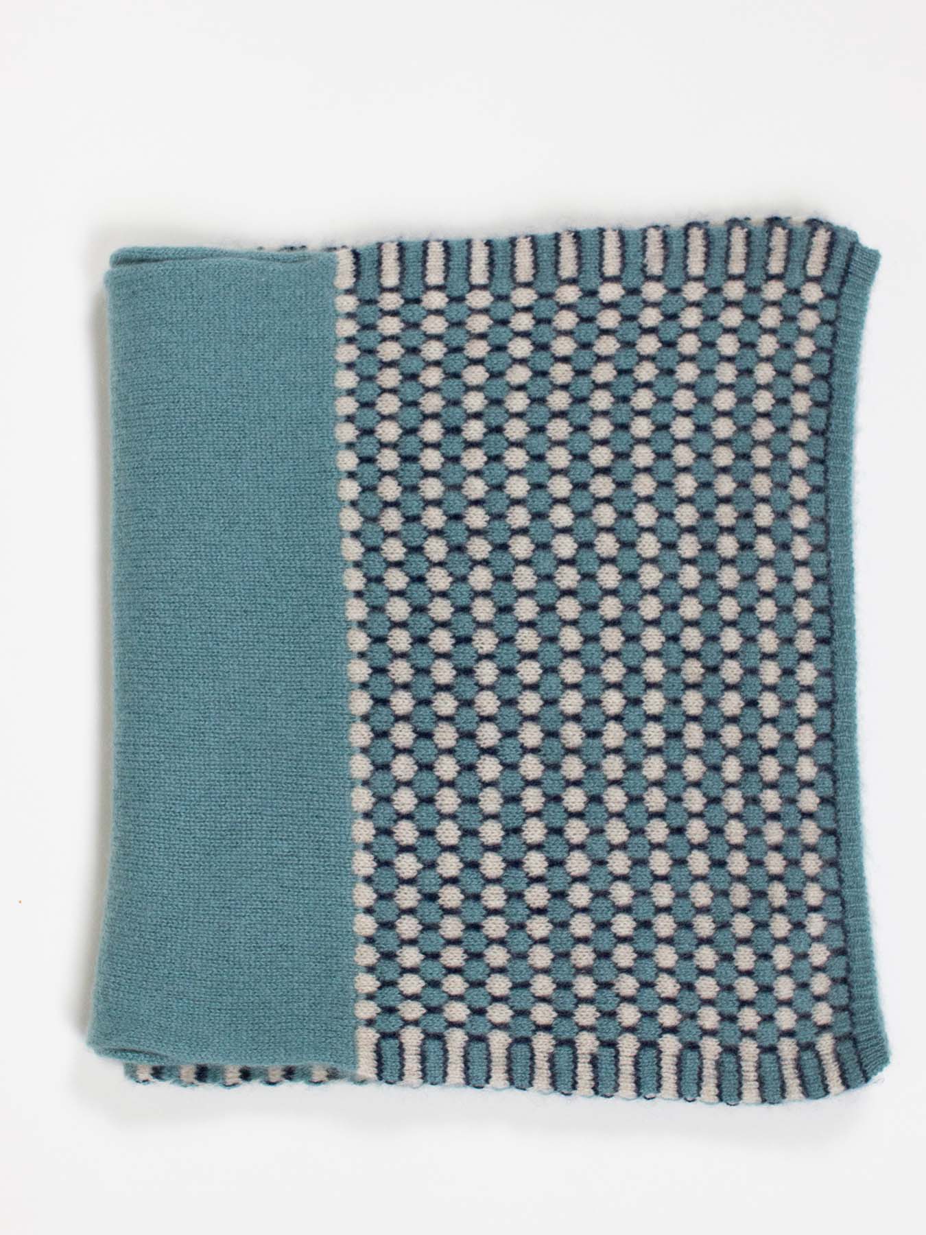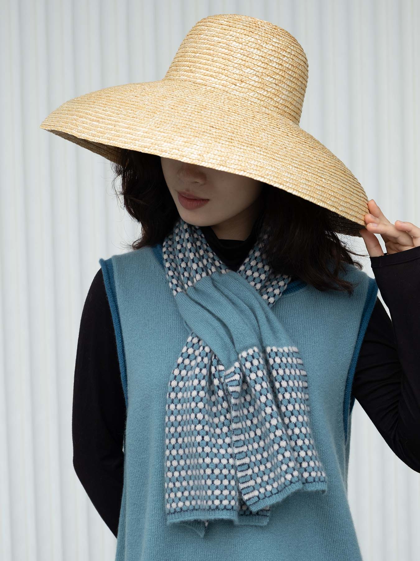 This blue polka-dotted cashmere scarf brings a refreshing pop of color to your winter wardrobe. Crafted from luxurious Mongolian cashmere, it features a playful pattern of light blue and white dots, adding a fun, modern twist to a classic design. The keyhole styling makes it easy to wear, allowing you to tie it effortlessly into a chic bow. Lightweight yet warm, this scarf is perfect for adding both comfort and a touch of elegance to any outfit, whether for everyday wear or travel.